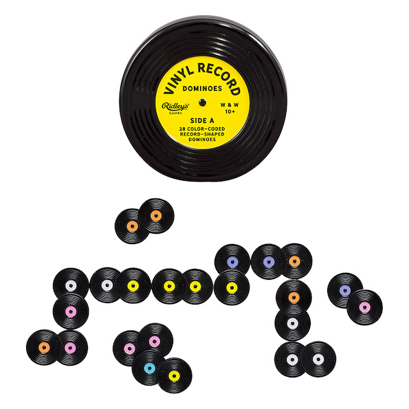Svojim inovativnim idejama Ridley's Games uspeli su da ožive stare klasične igre. Kao deo kolekcije Ridley's Games, dizajnerskog brenda Wild and Wolf dolaze malo drugačije domine. U pitanju su domine u obliku gramofonskih ploča. Domine su se u Evropi pojavile u 18. veku. Prvo u Italiji, а zatim u Francuskoj, gde su jedno vreme bile nacionalni hobi. Domine su društvena igra koja razvija veštinu zapažanja i kombinatorike. Mogu ih igrati i deca i odrasli. Domine u obliku gramofonskih ploča iz kolekcije Ridley's Games obeležene su različitim bojama i cilj igre je da posle pet rundi imamo što manje domina. U setu se dobija 28 okruglih pločica. Domine su spakovane u metalnu kutiju i namenjene su za uzrast 10+. Ove nesvakidašnje domine mogu da igraju dva ili četiri igrača i prosečno trajanje igre je oko dvadesetak minuta. Idealna igra za celu porodicu.