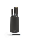 Iz brenda JosephJoseph dolazi set od pet visoko-kvalitetnih noževa sa rotirajućim postoljem. Lepeza Elevate proizvoda je specifično stvorena kako bi se nered u kuhinji sveo na najmanju moguću meru a higijena i zdravlje ukućana povećali. Svaki nož ima inovativnu dršku sa integrisanom "grbicom" koja sprečava da sečivo stupi u kontakt sa radnom površinom, kada se nož položi na nju. Ovi noževi su napravljeni od najkvalitetnijeg japanskog nerđajućeg čelika i imaju nelepljiva sečiva presvučena silikonom kao i udobne, ergonomske drške. Elevate rotirajuće postolje je izuzetno čvrsto i ima neklizajuću bazu kao i univerzalne magnetne slotove koji noževe drže čvrsto priljubljene uz sebe, što je bitno iz bezbednosnih razloga. Set noževa se sastoji od: reckastog noža od 12,7 cm, santoku noža od 14 cm, kuvarskog noža od 16,5 cm, običnog noža za sečenje od 20,3 cm i noža za hleb od 20,3 cm. Noževi nisu pogodni za mašinsko pranje. BPA free.