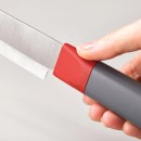 Set kuhinjskih noževa iz kolekcije Duo brenda JosephJoseph je inovativnog dizajna kako bi se nered u kuhinji sveo na najmanju moguću meru a higijena i zdravlje ukućana povećali. Svaki nož ima ergonomsku dršku za lakše manipulisanje pri sečenju. Ovi noževi su napravljeni od najkvalitetnijeg japanskog  nerđajućeg čelika i imaju nelepljiva sečiva presvučena silikonom kao i udobne, ergonomske drške. Elegantno postolje  zauzima manje mesta na radnoj površini i poseduje magnetne slotove koji noževe drže čvrsto priljubljene uz sebe, što je bitno iz bezbednosnih razloga. Set noževa se sastoji od: kuvarskog noža, reckastog noža za hleb, santoku noža , noža za povrće i noža za ribu. Noževi se peru ručno i brišu suvom krpom. Dizajnirani su tako da zauzimaju malo kuhinjskog prostora, a istovremeno mogu da budu lep ukras u svakoj kuhinji zbog svog minimalističkog dizajna. Kolekcija Duo nudi širok asortiman proizvoda od kvalitetnih materijala, inovativnog dizajna koji će naravno biti od velike koristi u Vašoj kuhinji. Duo Knife Block Set je jedan od tih proizvoda. Takodje je idealan poklon za svakog ko se useljava u novi dom.